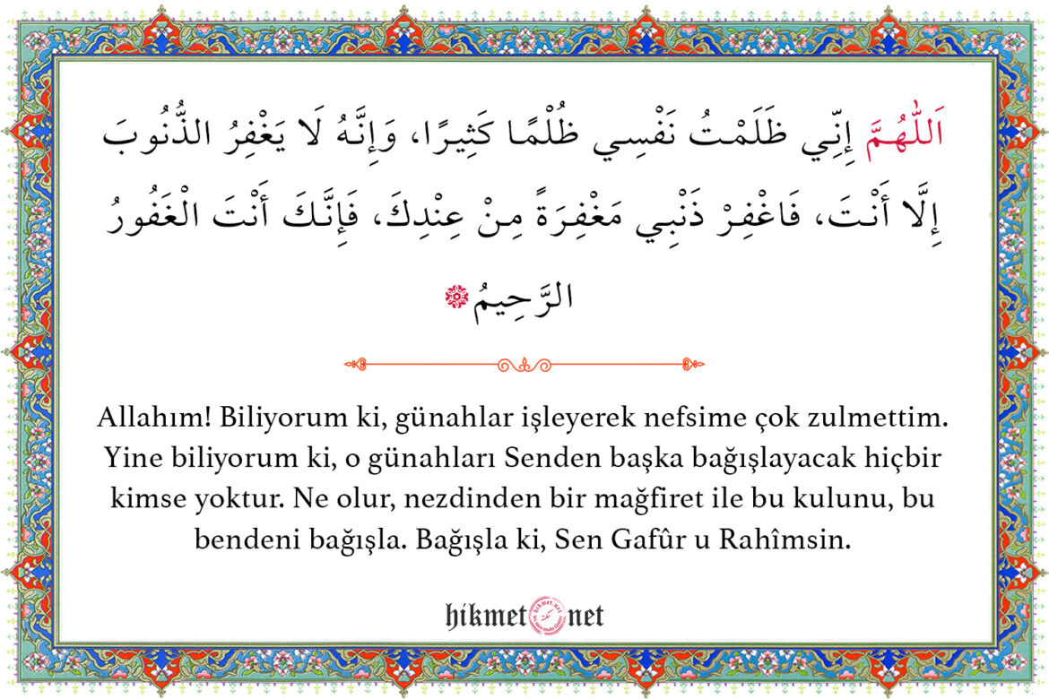 Allahım! Biliyorum ki, günahlar işleyerek nefsime çok zulmettim. Yine biliyorum ki, o günahları Senden başka bağışlayacak hiçbir kimse yoktur. Ne olur, nezdinden bir mağfiret ile bu kulunu, bu bendeni bağışla. Bağışla ki, Sen Gafûr u Rahîmsin.