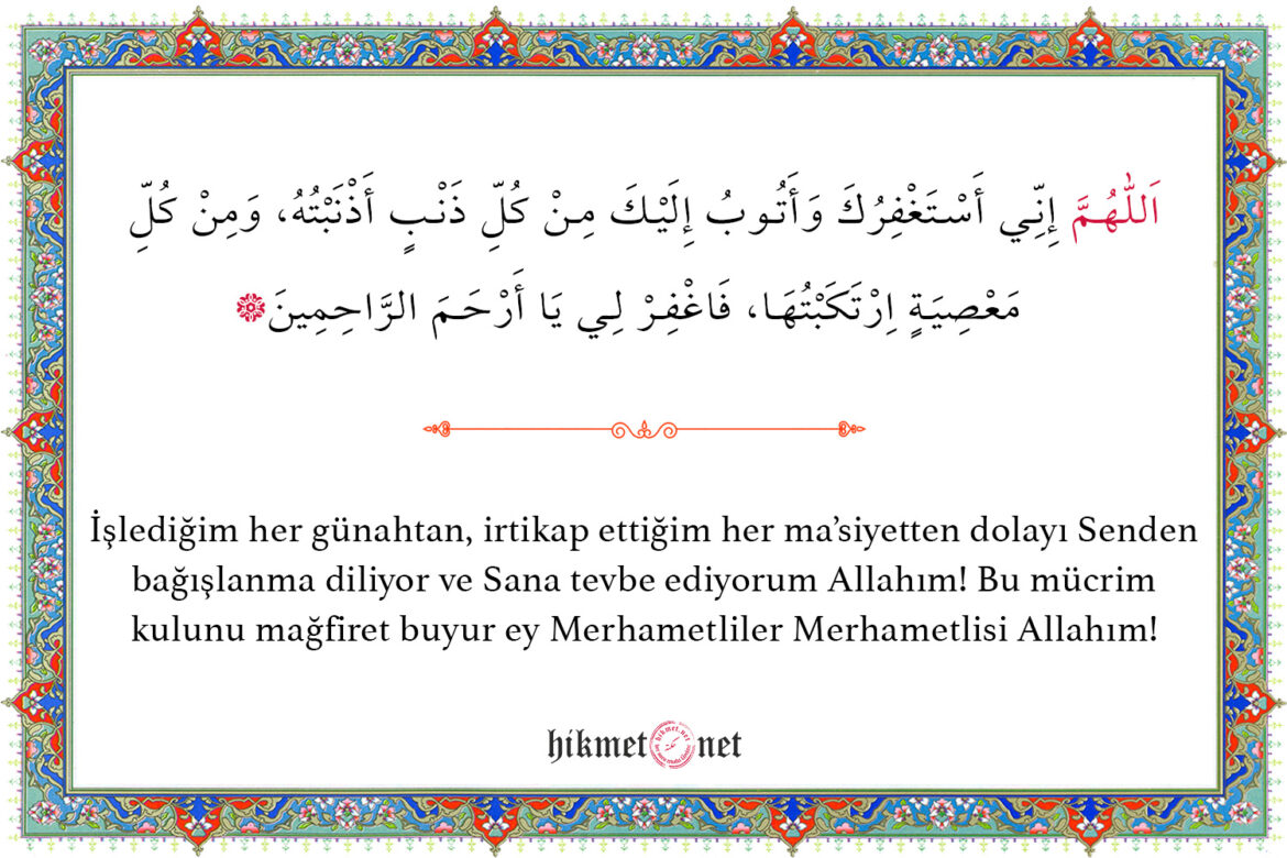 İşlediğim her günahtan, irtikap ettiğim her ma’siyetten dolayı Senden bağışlanma diliyor ve Sana tevbe ediyorum Allahım! Bu mücrim kulunu mağfiret buyur ey Merhametliler Merhametlisi Allahım!
