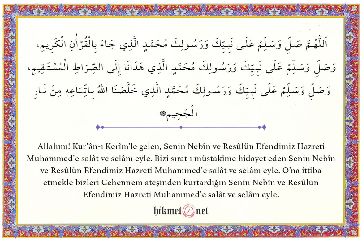 Allahım! Kur’ân-ı Kerîm’le gelen, Senin Nebîn ve Resûlün Efendimiz Hazreti Muhammed’e salât ve selâm eyle. Bizi sırat-ı müstakîme hidayet eden Senin Nebîn ve Resûlün Efendimiz Hazreti Muhammed’e salât ve selâm eyle.