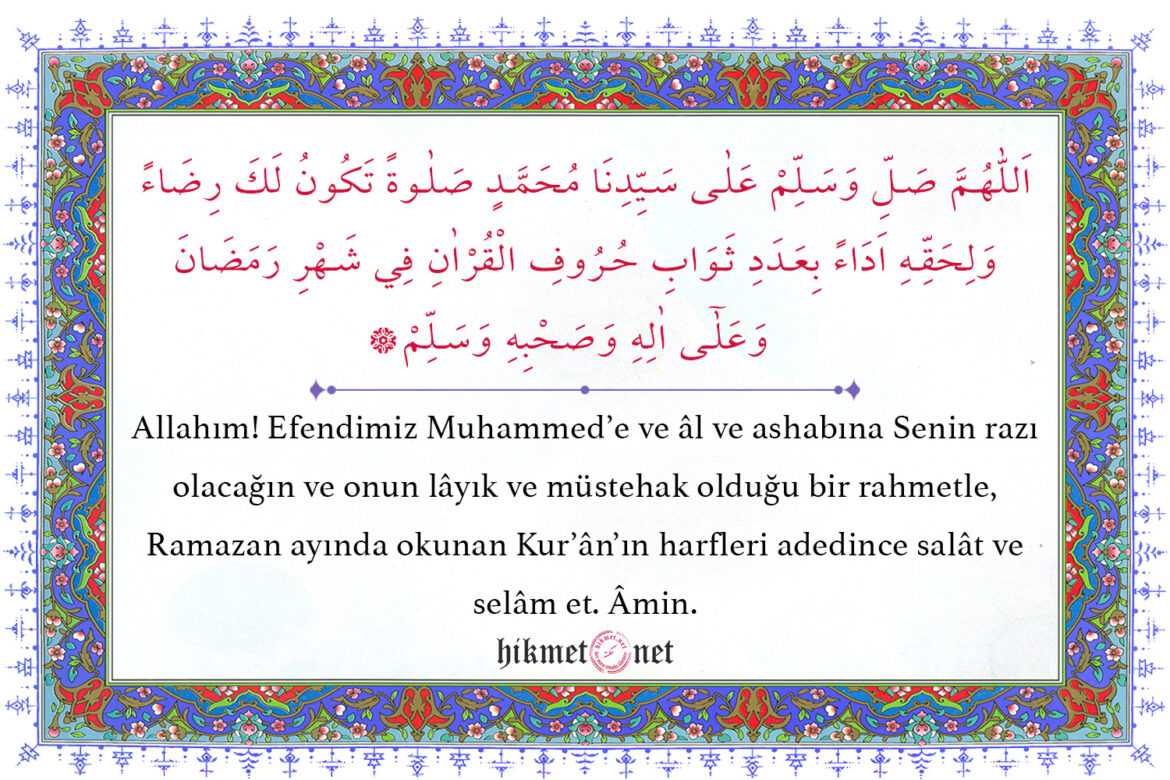 Allahım! Efendimiz Muhammed’e ve âl ve ashabına Senin razı olacağın ve onun lâyık ve müstehak olduğu bir rahmetle, Ramazan ayında okunan Kur’ân’ın harfleri adedince salât ve selâm et. Âmin.