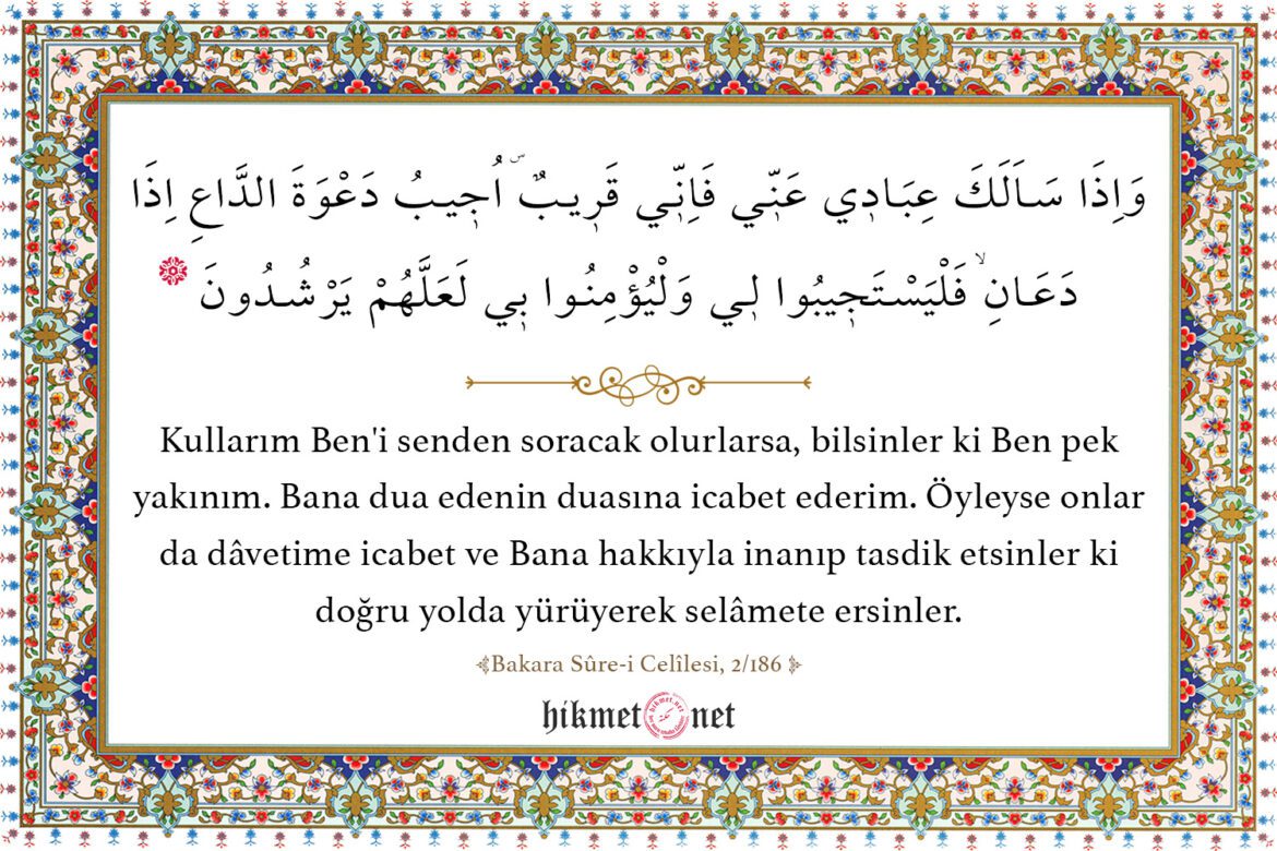 Kullarım Ben’i senden soracak olurlarsa, bilsinler ki Ben pek yakınım. Bana dua edenin duasına icabet ederim. Öyleyse onlar da dâvetime icabet ve Bana hakkıyla inanıp tasdik etsinler ki doğru yolda yürüyerek selâmete ersinler. (Bakara Sûre-i Celîlesi, 2/186)