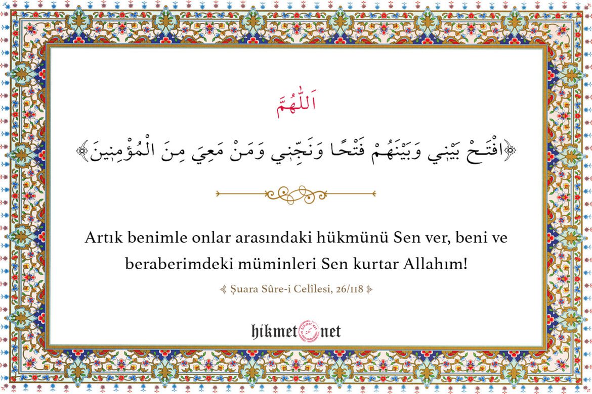 Artık benimle onlar arasındaki hükmünü Sen ver, beni ve beraberimdeki müminleri Sen kurtar Allahım! ( Şuara Sûre-i Celîlesi, 26/118)
