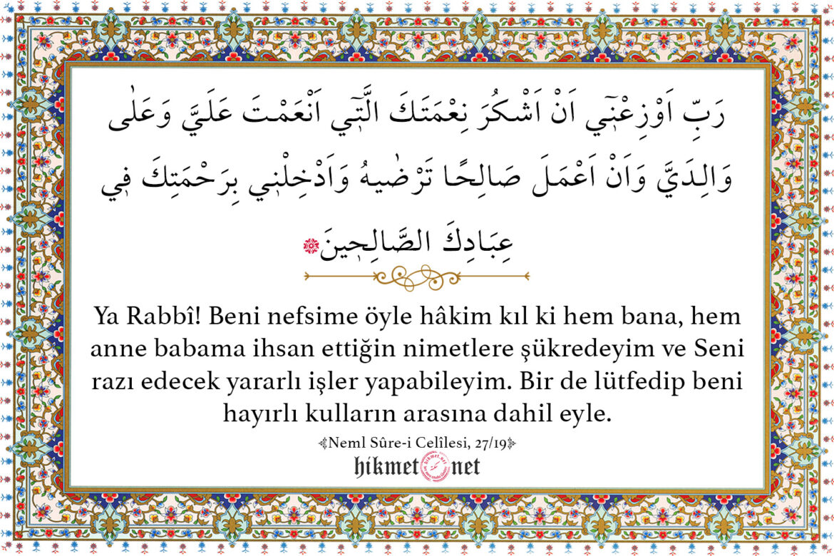 Ya Rabbî! Beni nefsime öyle hâkim kıl ki hem bana, hem anne babama ihsan ettiğin nimetlere şükredeyim ve Seni razı edecek yararlı işler yapabileyim. Bir de lütfedip beni hayırlı kulların arasına dahil eyle. (Neml Sûre-i Celîlesi, 27/19)