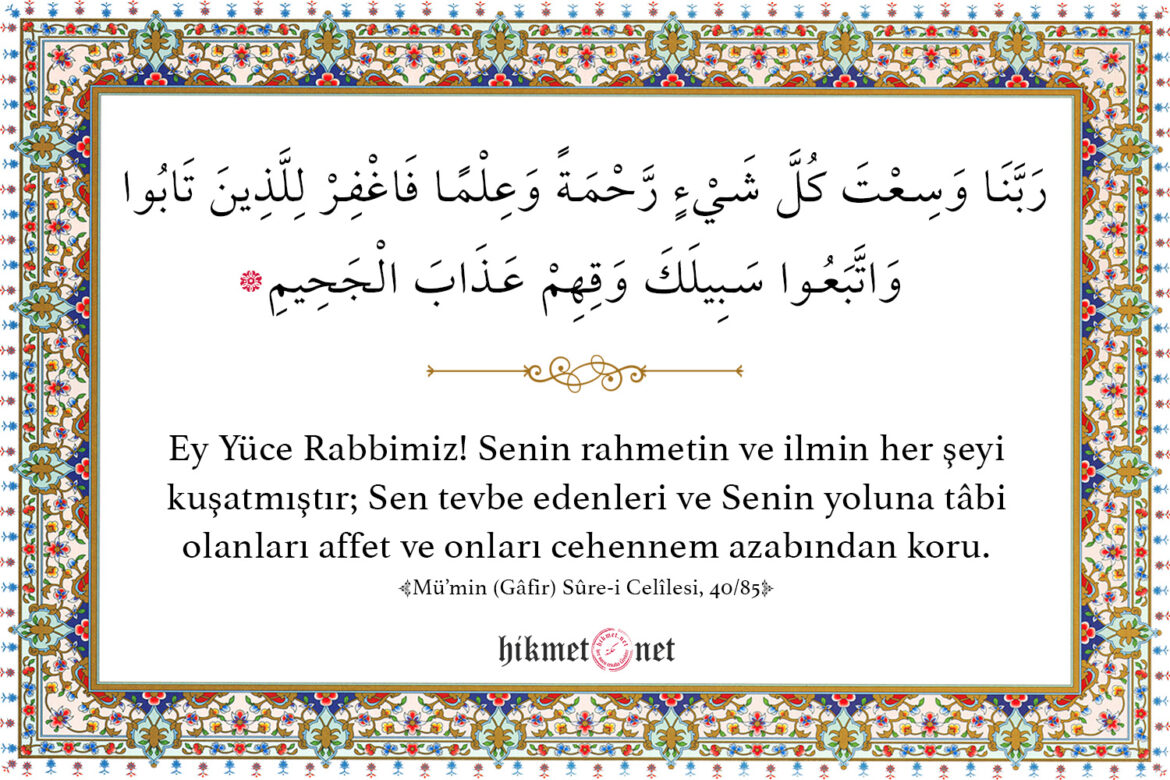 Ey Yüce Rabbimiz! Senin rahmetin ve ilmin her şeyi kuşatmıştır; Sen tevbe edenleri ve Senin yoluna tâbi olanları affet ve onları cehennem azabından koru.  (Mü’min (Gâfir) Sûre-i Celîlesi, 40/85)
