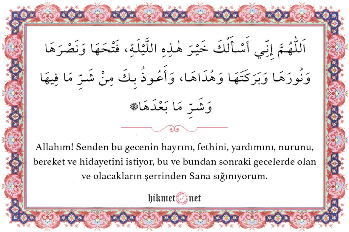 Allahım! Senden bu gecenin hayrını, fethini, yardımını, nurunu, bereket ve hidayetini istiyor, bu ve bundan sonraki gecelerde olan ve olacakların şerrinden Sana sığınıyorum.
