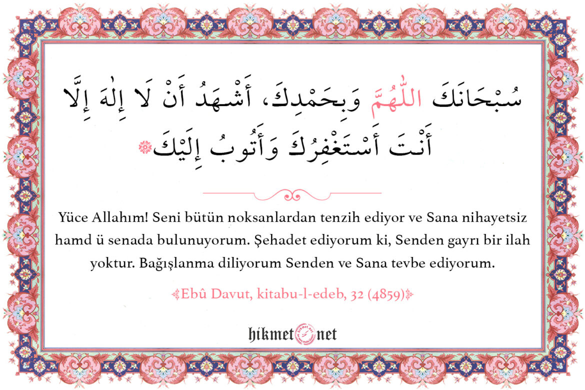 Yüce Allahım! Seni bütün noksanlardan tenzih ediyor ve Sana nihayetsiz hamd ü senada bulunuyorum. Şehadet ediyorum ki, Senden gayrı bir ilah yoktur. Bağışlanma diliyorum Senden ve Sana tevbe ediyorum. (Ebû Davut, kitabu-l-edeb, 32 (4859))