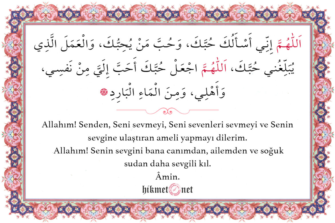 Allahım! Senden, Seni sevmeyi, Seni sevenleri sevmeyi ve Senin sevgine ulaştıran ameli yapmayı dilerim. Allahım! Senin sevgini bana canımdan, ailemden ve soğuk sudan daha sevgili kıl. Âmin.