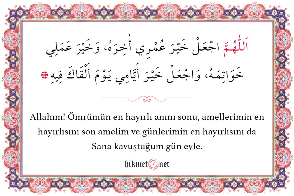 Allahım! Ömrümün en hayırlı anını sonu, amellerimin en hayırlısını son amelim ve günlerimin en hayırlısını da Sana kavuştuğum gün eyle.