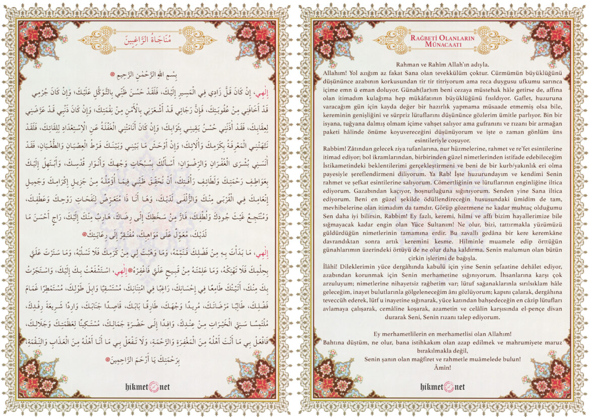 İlâhî! Dileklerimin yüce dergâhında kabulü için yine Senin şefaatine dehâlet ediyor, azabından korunmak için Senin merhametine sığınıyorum. İhsanlarına karşı çok arzuluyum; nimetlerine nihayetsiz rağbetim var; lütuf sağanaklarınla sırılsıklam hâle geleceğim, inayet bulutlarınla gölgeleneceğim ânı gözlüyorum; kapını çalarak, dergâhına teveccüh ederek, lütf u inayetine sığınarak, yüce katından bahşedeceğin en câzip lütufları avlamaya çalışarak, cemâline koşarak, azametin ve celâlin karşısında el-pençe divan durarak Seni, Senin rızanı talep ediyorum. Ey merhametlilerin en merhametlisi olan Allahım! Bahtına düştüm, ne olur, bana istihkakım olan azap edilmek ve mahrumiyete maruz bırakılmakla değil, Senin şanın olan mağfiret ve rahmetle muâmelede bulun! Âmîn!